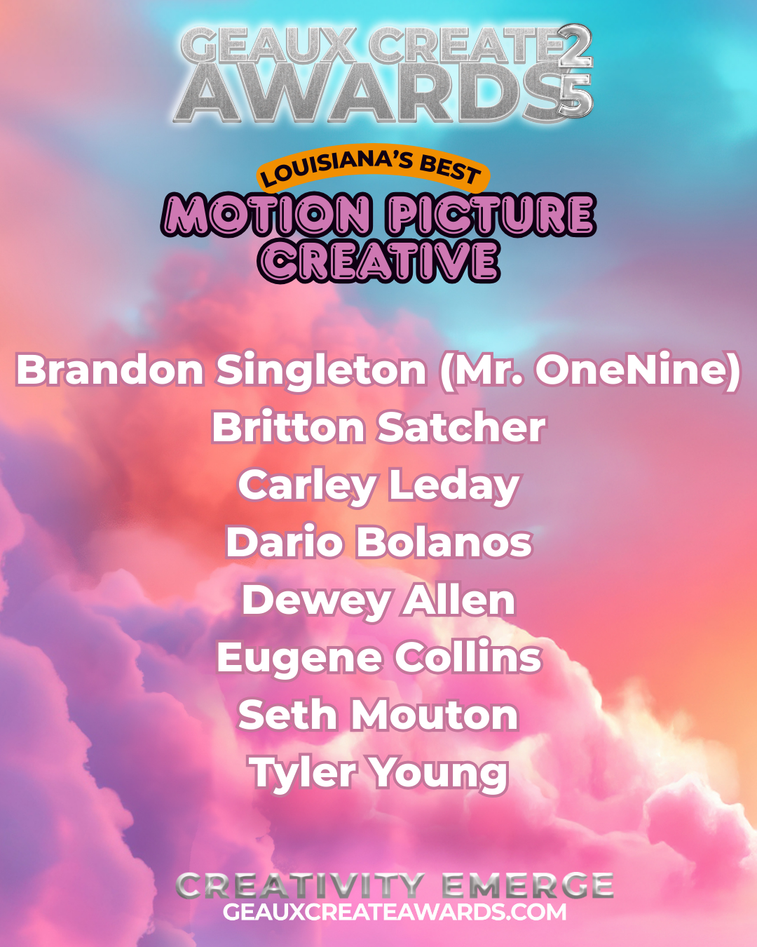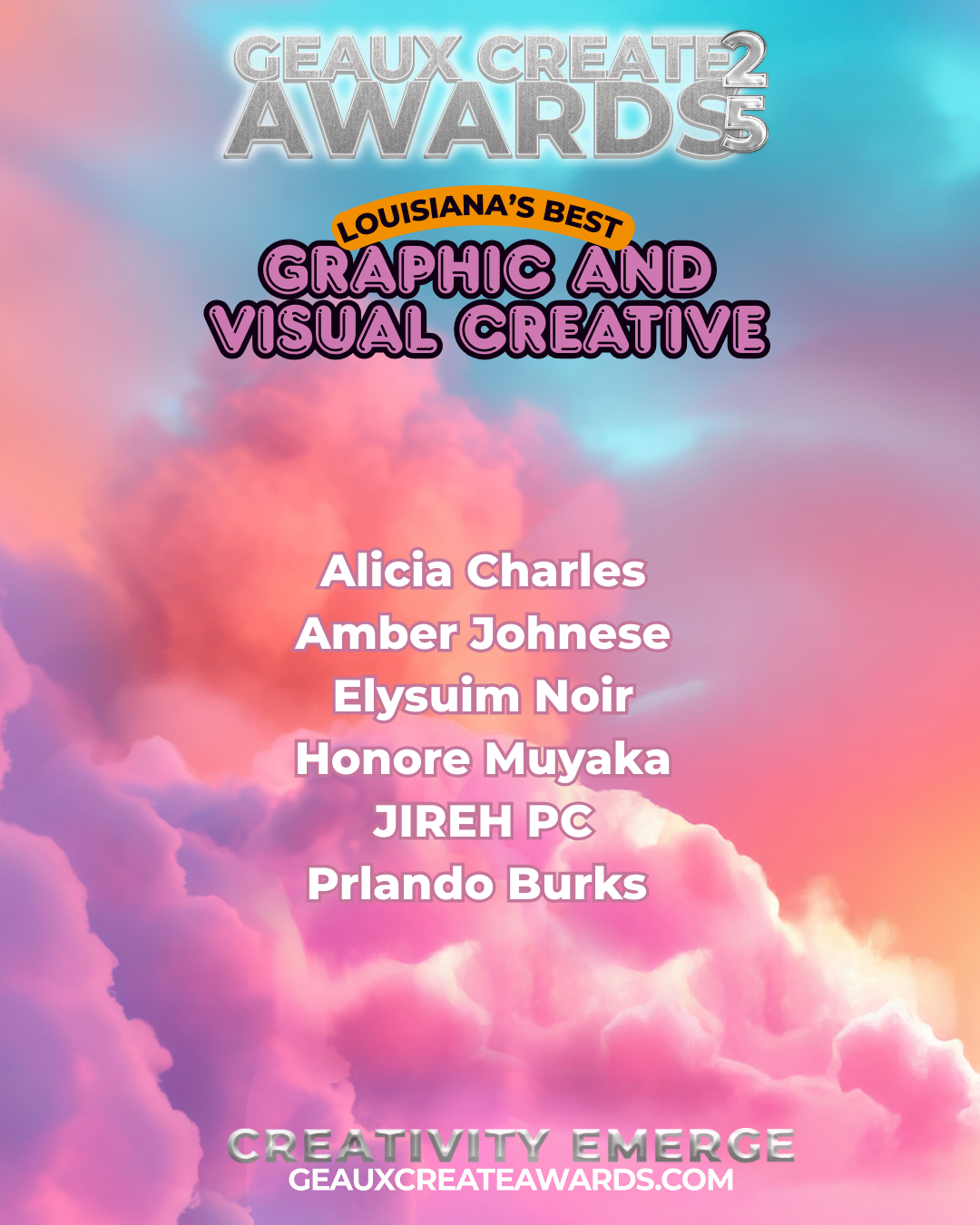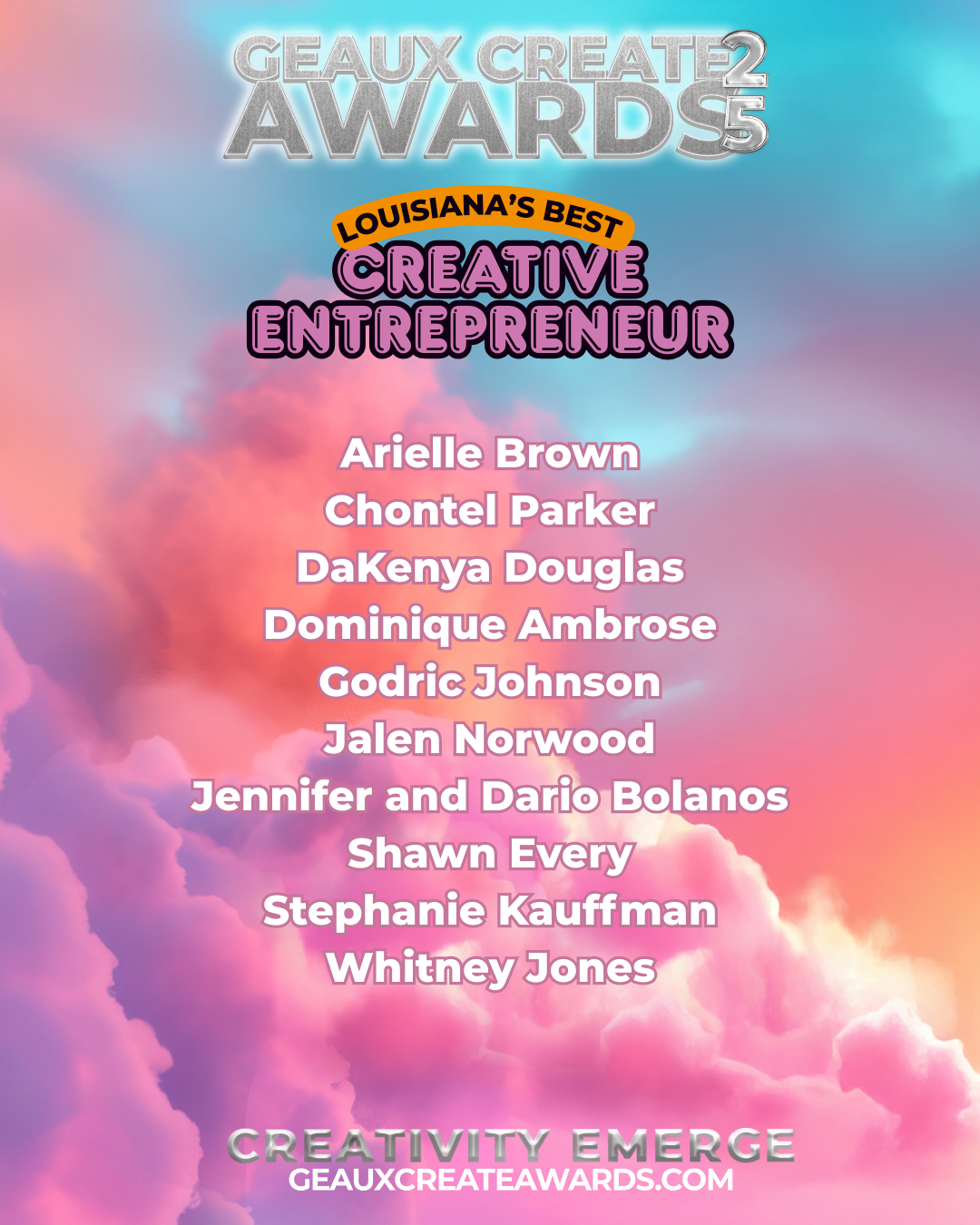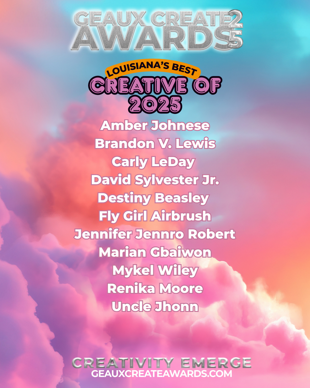 “Over 200 Louisiana creatives have been pre-nominated for the Geaux Create Awards — proof that our state is overflowing with raw, unstoppable talent.”
