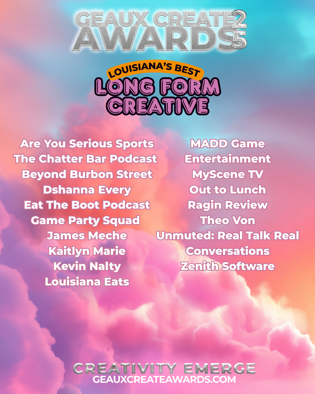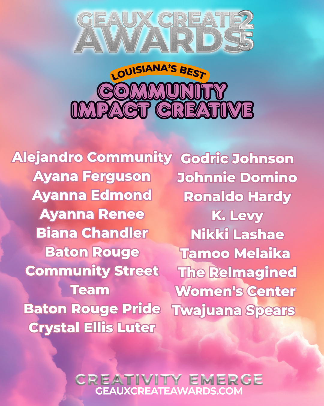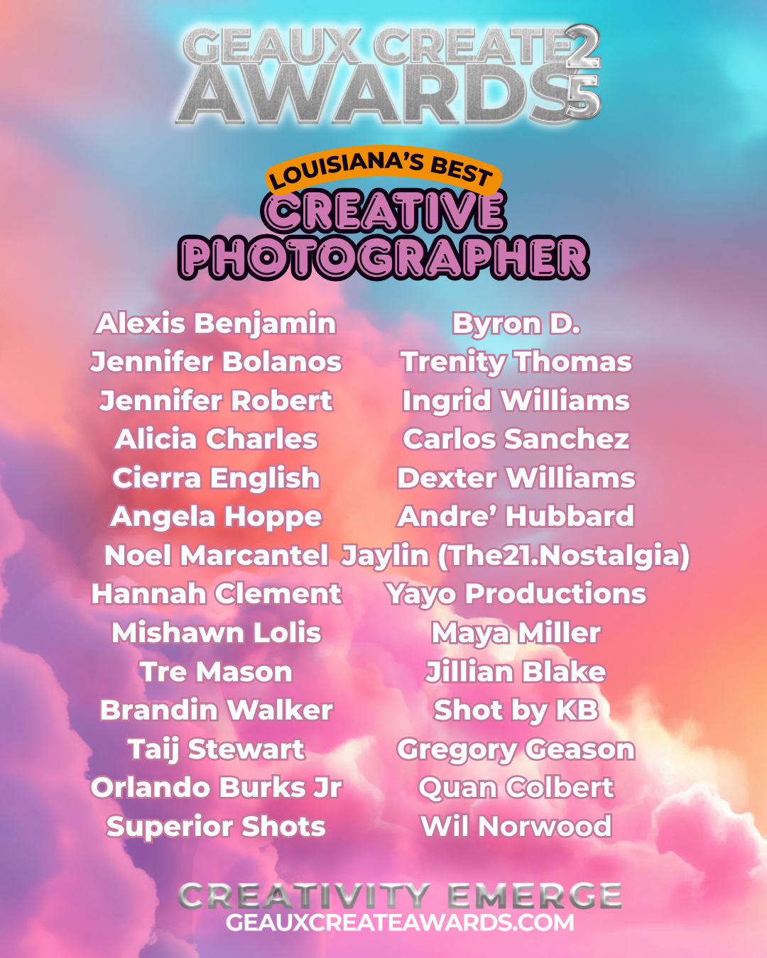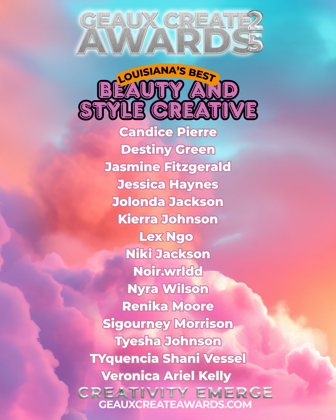 “Over 200 Louisiana creatives have been pre-nominated for the Geaux Create Awards — proof that our state is overflowing with raw, unstoppable talent.”