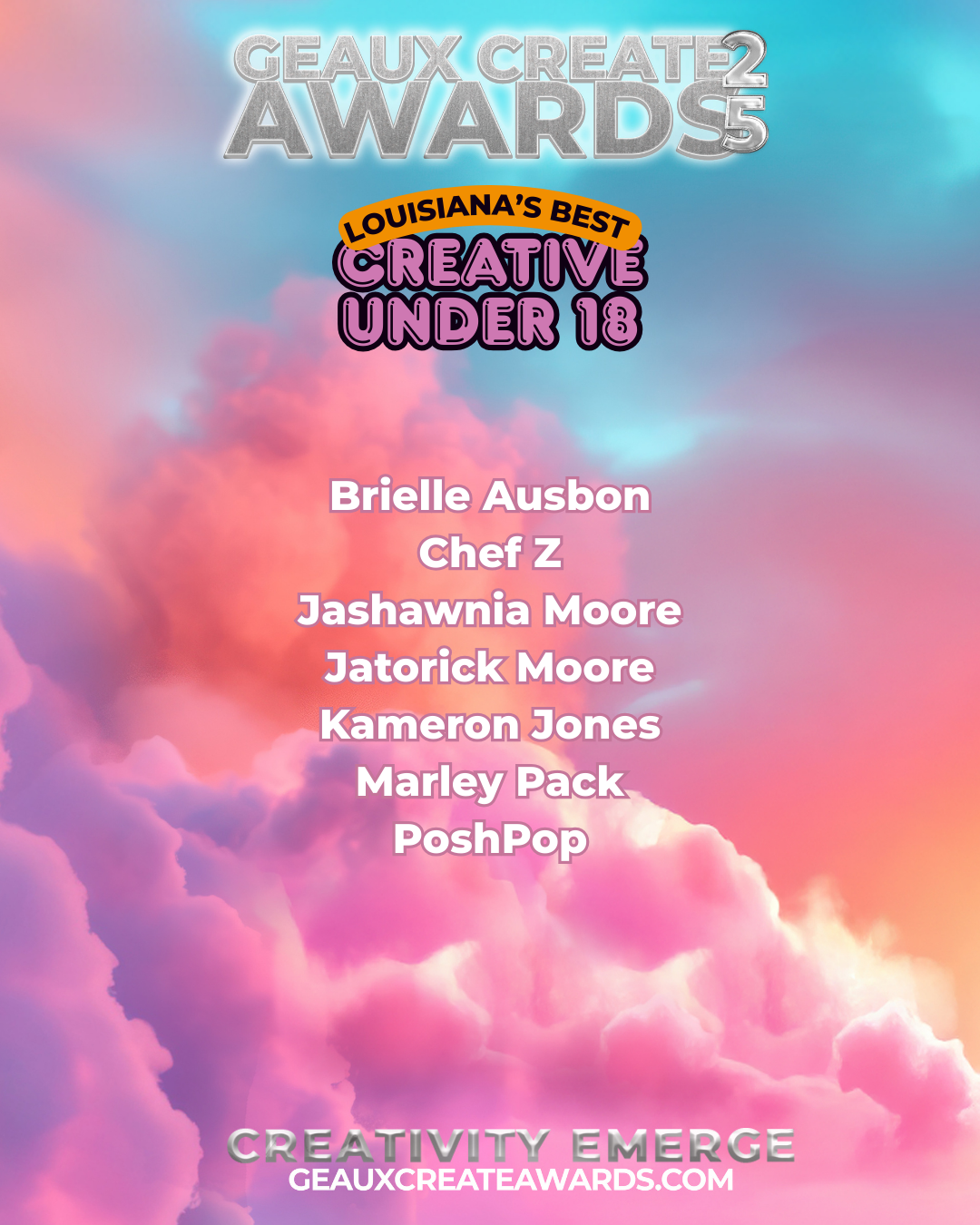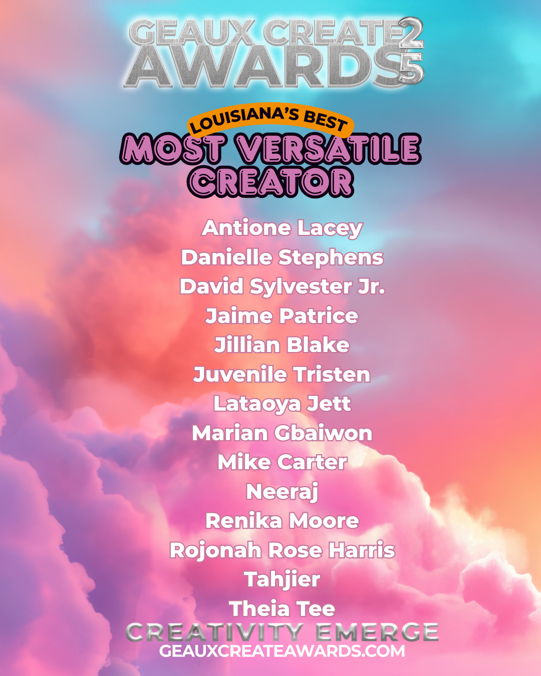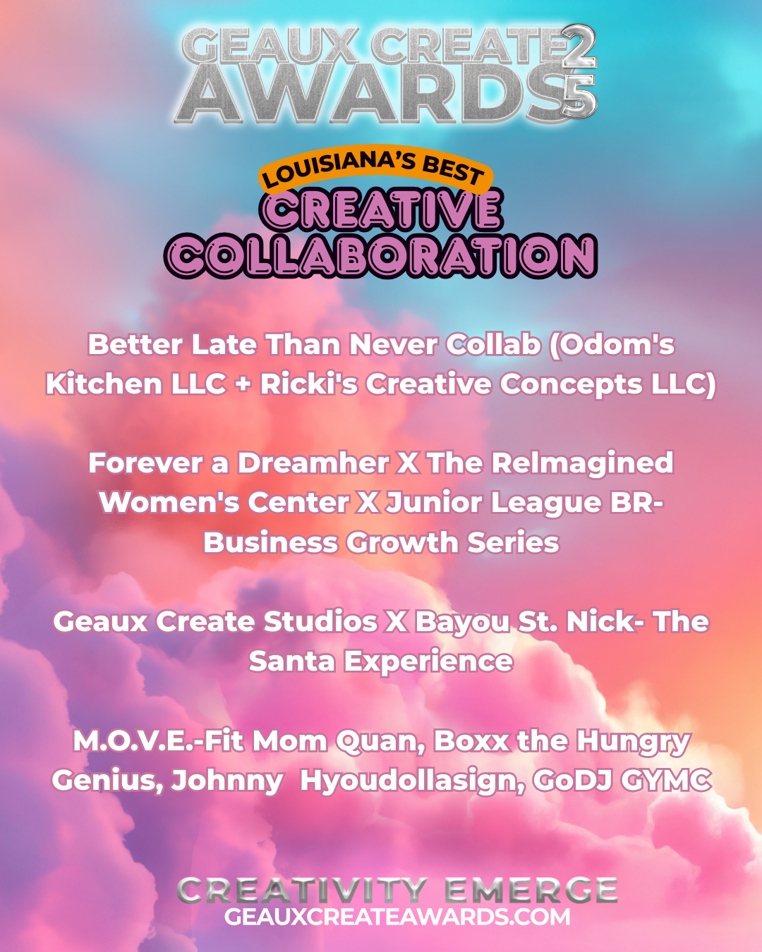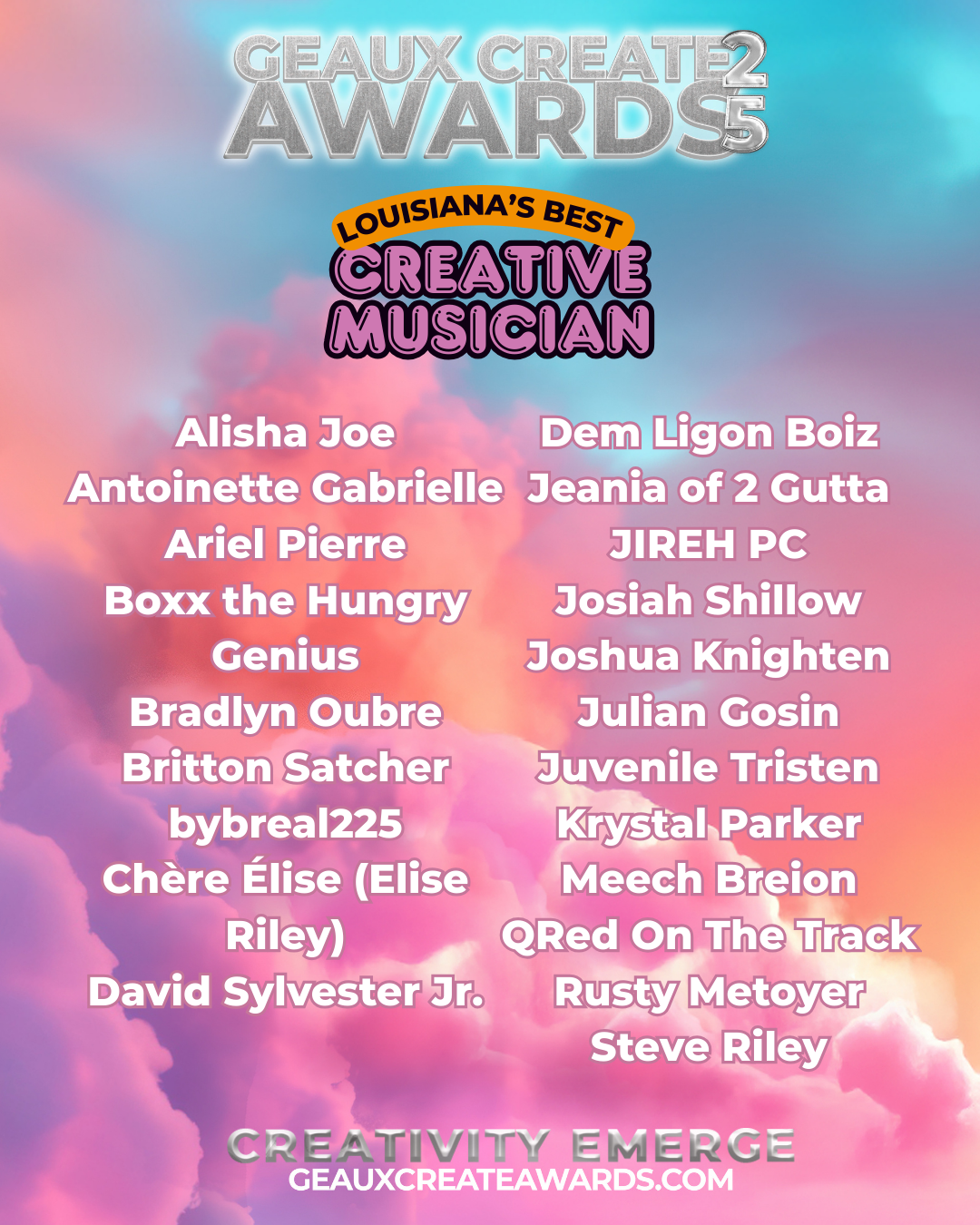 “Over 200 Louisiana creatives have been pre-nominated for the Geaux Create Awards — proof that our state is overflowing with raw, unstoppable talent.”