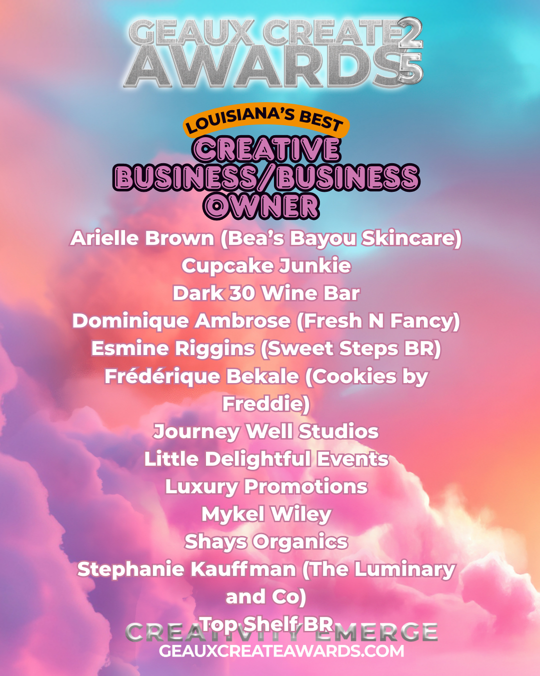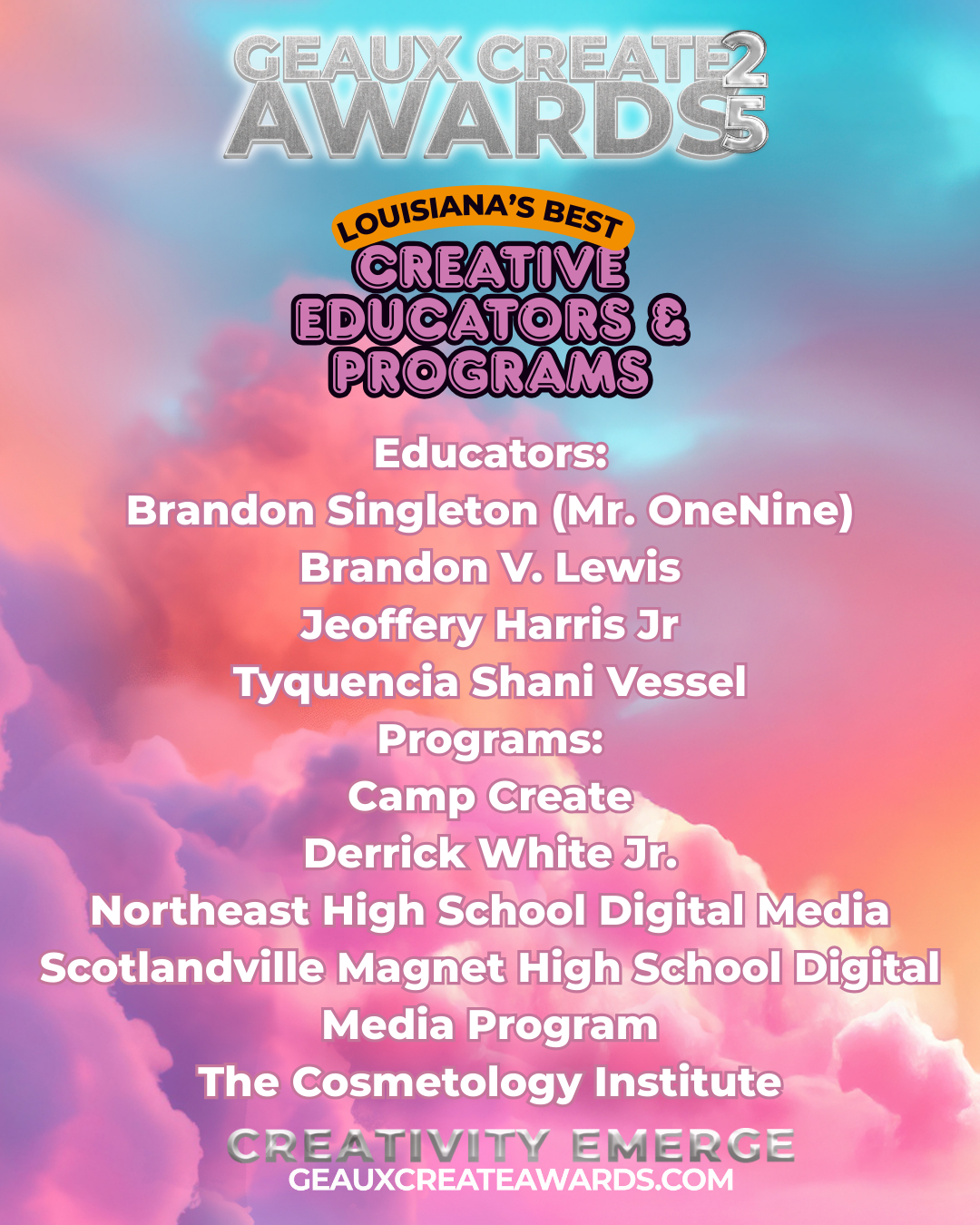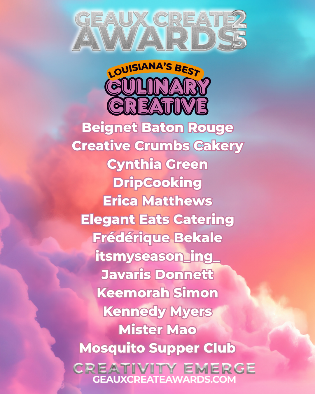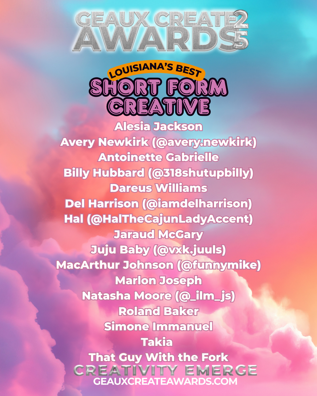 “Over 200 Louisiana creatives have been pre-nominated for the Geaux Create Awards — proof that our state is overflowing with raw, unstoppable talent.”
